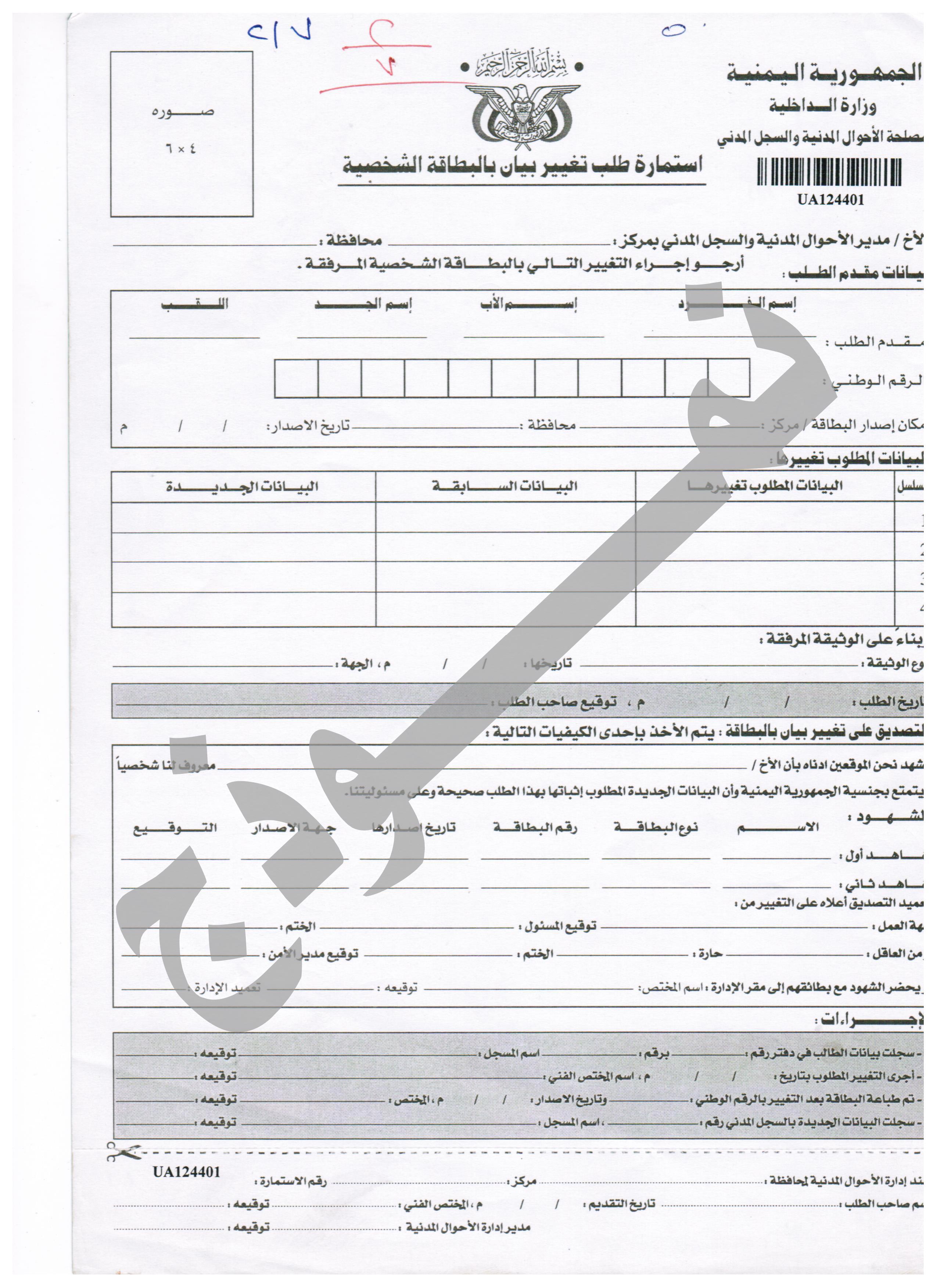 نموذج طلب تغير بيان بالبطاقة الشخصية