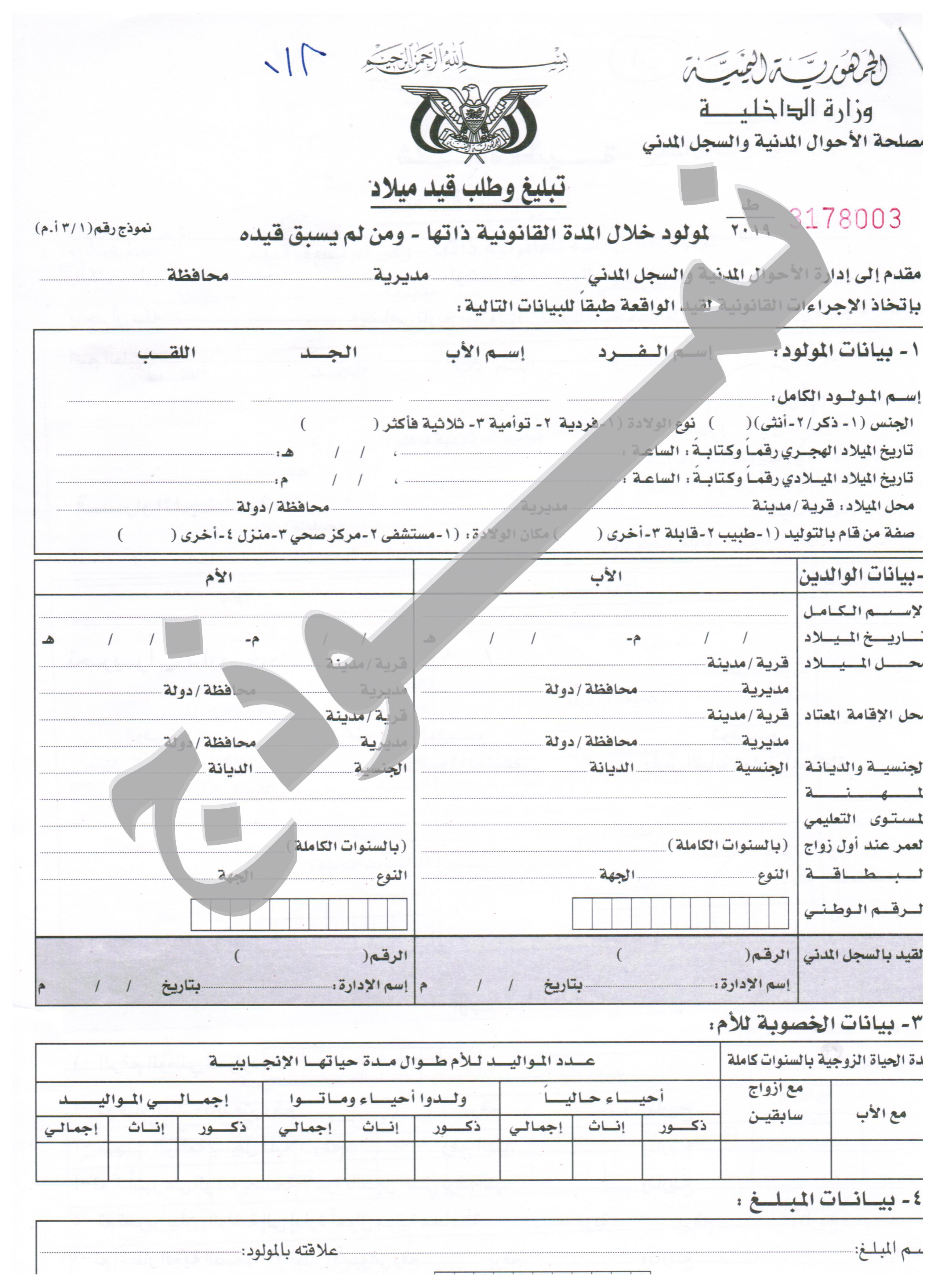 نموذج تبليغ وطلب الحصول على شهادة ميلاد
